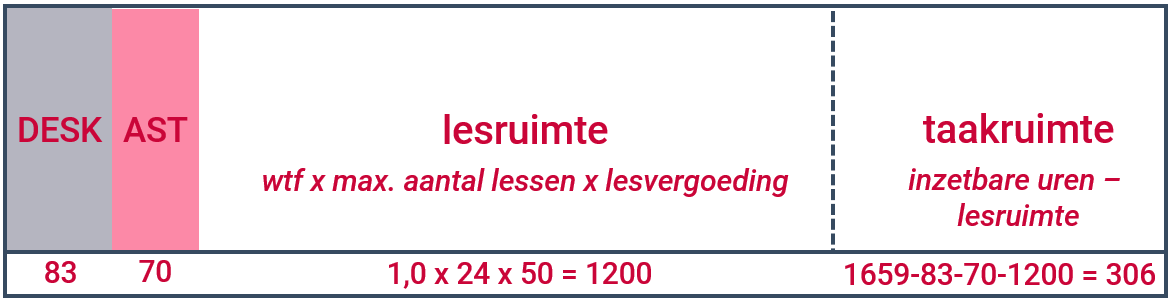 In deze afbeelding ziet u de berekening van de lesruimte en de taakruimte terug. De getallen zijn een rekenvoorbeeld.
