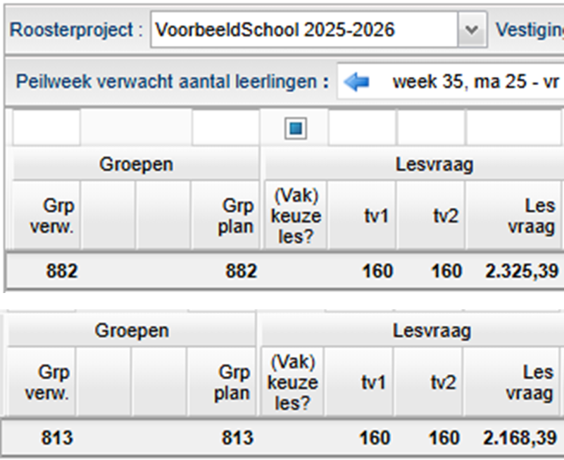 In dit voorbeeld wordt de verlaging van de opslagfactor gecombineerd met het verhogen van het maximaal aantal lessen. Hierdoor neemt de lesruimte EN de taakruimte toe.