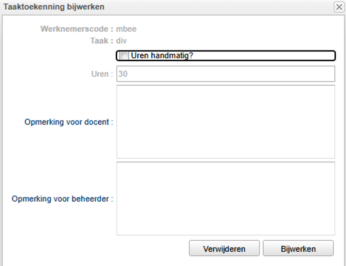 In het scherm Personeel > Takenverdeling > Takenverdeling is de modus plaatsen/bewerken verwijderd. Een taak toekennen, aanpassen of verwijderen doet u door de cel aan te klikken en te bewerken: