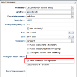 Dit doet u door een vinkje te plaatsen bij het aanmaken van een verlof (Tonen op tabblad Afwezigheden).