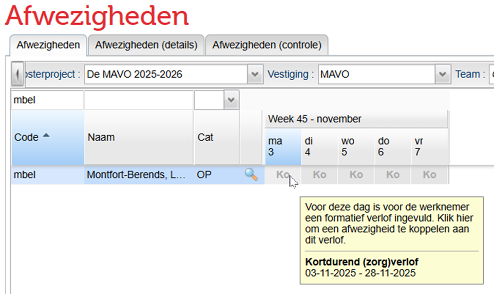 De (dag)roostermaker kan vervolgens een incidentele afwezigheid aanmaken zodat er in het dagrooster een vervanger kan worden ingeroosterd. Of de les komt te vervallen.