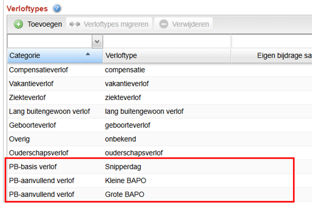Het is inmiddels mogelijk om eigen verloftypes aan te maken. Deze worden gekoppeld aan één van de bestaande categorieën. Op deze wijze kan bijvoorbeeld de term PB-basis of PB-aanvullend verlof vervangen worden. Het eigen verloftype wordt getoond op de formatiekaart van de medewerker. In onderstaande afbeelding zijn er drie eigen verloftypes aangemaakt: Snipperdag, Kleine BAPO en Grote BAPO. Ze worden gekoppeld aan PB-basis en PB-aanvullend verlof.