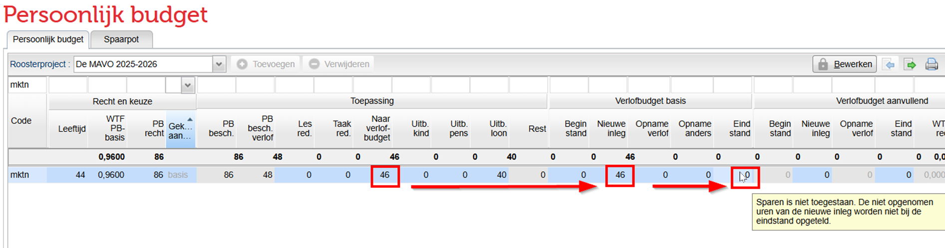 In de CAO-VO is niet meer vastgelegd dat sparen een recht is. De school kan nu zelf per project instellen of de uren uit het PB-basisrecht gespaard mogen worden. Dat doet u bij de Projectinstellingen. Als sparen niet is toegestaan, worden niet opgenomen uren niet aan de spaarpot toegevoegd.