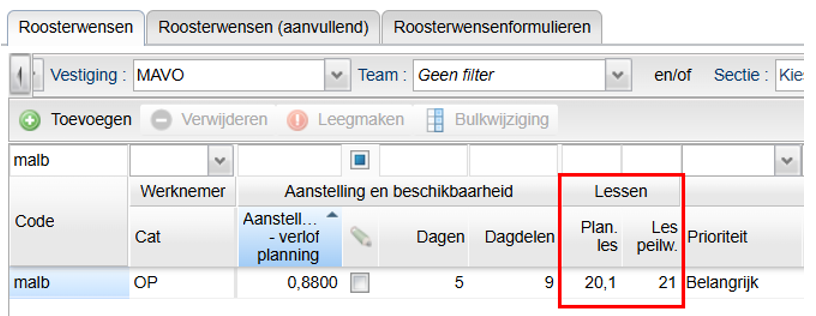 Dat betekent dat u beter zicht heeft op de verhouding tussen aantal te geven lessen en beschikbaarheid. In de kolom Plan.les staat het aantal lessen dat de medewerker zou moeten geven en de in de kolom Les peilw. staat het daadwerkelijke aantal voor de geselecteerde peilweek.