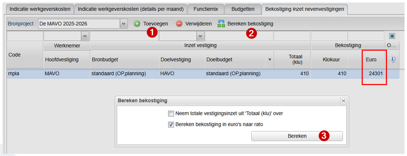 Wanneer u werkt met nevencontracten kunt u nu eenvoudig de bekostiging verdelen over het hoofdproject en nevenprojecten. Zermelo vult automatisch de klokuren aan inzet op het nevenproject in bij een nieuwe invoer in het scherm Personeel > Financieel > Bekostiging inzet nevenvestiging. Vervolgens kan Zermelo ook voor u de kosten in euro's overhevelen naar het nevenproject met de knop <Bereken bekostiging>.