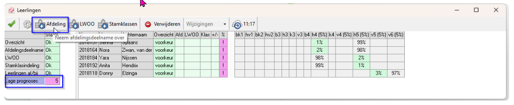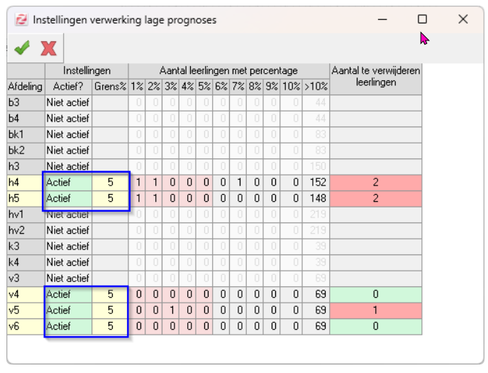 Leerlingen die een kleine kans hebben om uiteindelijk in de afdeling terecht te komen, kunt u tijdens het (proef)clusteren misschien beter negeren. U kunt deze leerlingen in beeld krijgen door in te stellen welke prognosepercentages u als ‘laag’ aanmerkt. U stelt dit in bij Leerlingen > Lage prognoses. Activeer de afdelingen waarvoor u de lage prognoses wilt verwijderen en stel in welk percentage u als laag aanmerkt. U ziet direct hoeveel leerlingen dit percentage hebben.