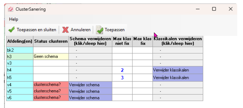 Zorg dat uw clusterschema’s en klassikalen volledig leeg zijn. Dit regelt u bij Roosteren + herindelen > Clusteren > Clusterstatus en sanering. Zorg dat alle afdelingen met een clusterschema op Verwijder schema staan en alle afdelingen met niet-gefixeerde klassikalen op Verwijder klassikalen.
