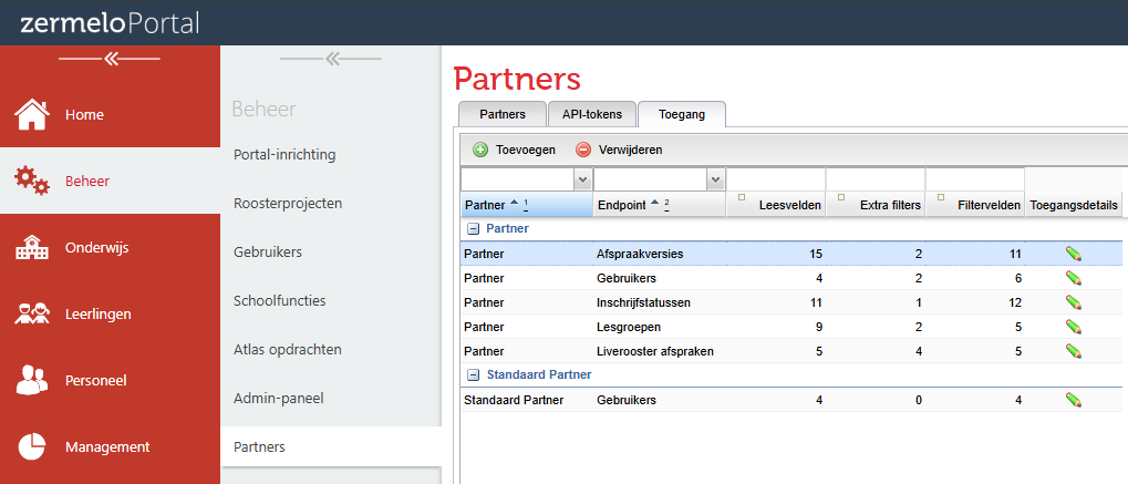 U geeft rechten aan partners via het nieuwe menu Beheer > Partners. U vindt hier drie tabbladen, waarin u de volgende zaken regelt: