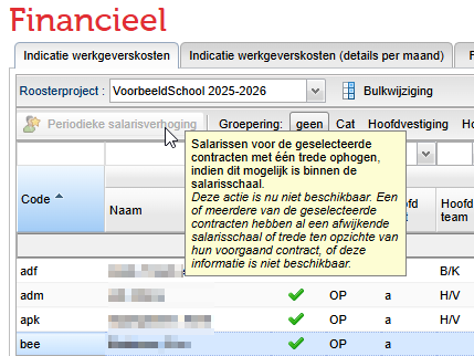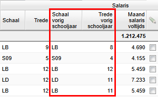 We hebben hiervoor ook twee (standaard verborgen) kolommen toegevoegd met de schaal en trede van het vorige schooljaar. Zo kunt u achterhalen waarom de periodieke salarisverhoging niet mogelijk is bij uw geselecteerde werknemers.