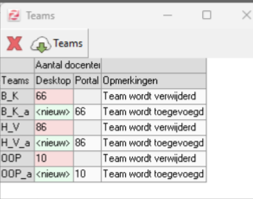 U zorgt er hier voor dat de teams in het portal en de desktop gelijk zijn aan elkaar. U haalt het tevoorschijn via het kopje Teams komen niet overeen in de gegevenscontrole. U komt er ook via het menu Docenten > Teams.
